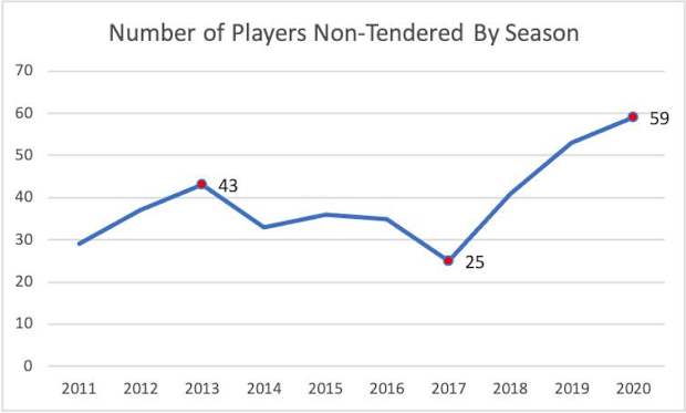It’s impossible to say for sure. But here’s the context for how the number of players non-tendered has shifted over the last 10 seasons: